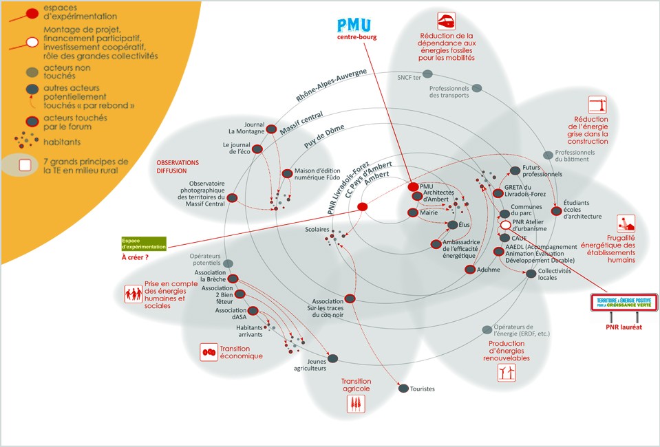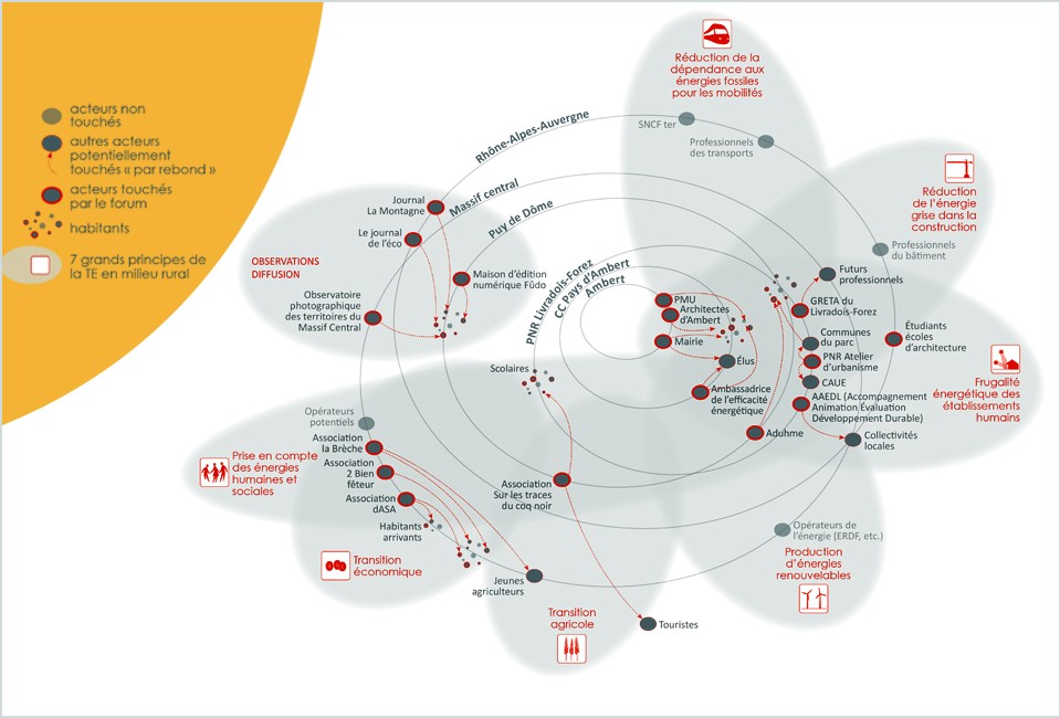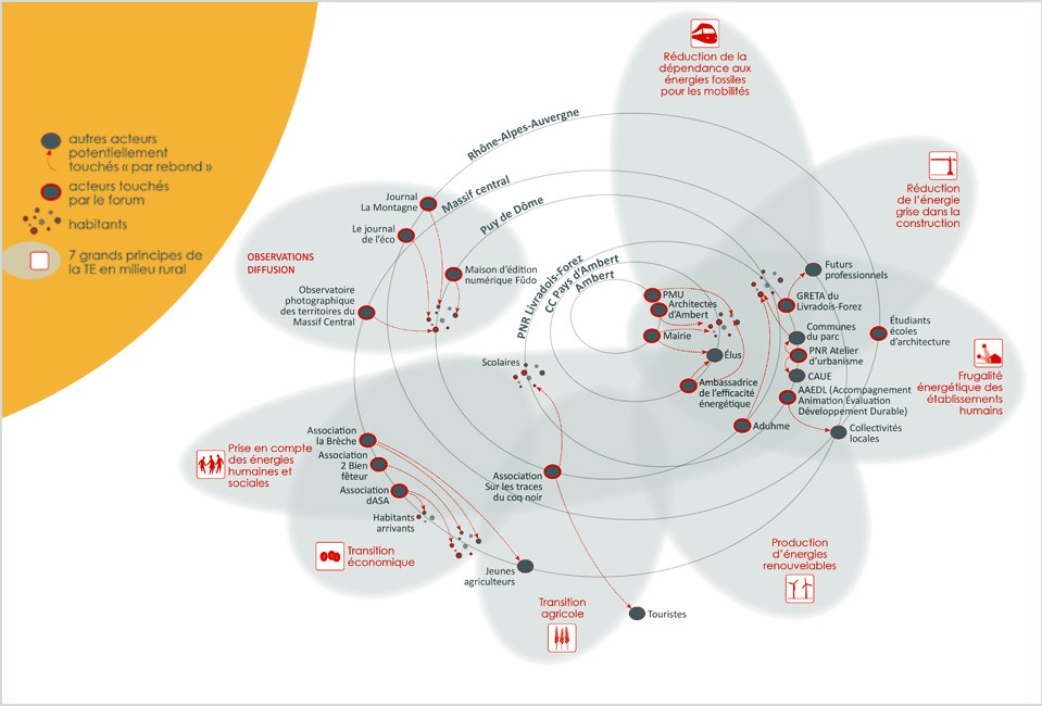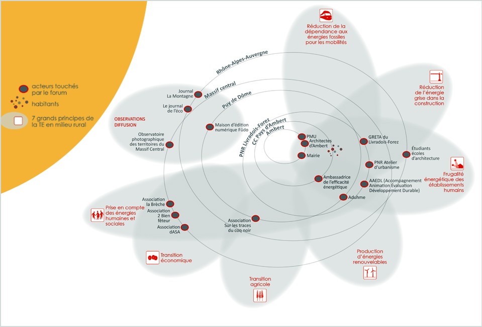 La maquette sociale est une représentation du collectif d’acteurs qui s’est rassemblé autour de la phase conclusive du projet de recherche, le forum « Viv(r)e la transition énergétique ». Sans portée institutionnelle, elle constitue une image de l’assemblage social qui peut concourir à une transition énergétique sur un territoire. Dresser cette cartographie en arrière-plan de la définition de nouveaux écosystèmes énergétiques territoriaux, c’est offrir des voies d’insertion pour des acteurs soucieux d’y participer. Comme toute maquette, elle tient du provisoire, mais rend visible une alternative aux macro-systèmes de l’énergie, fondée sur une approche décentralisée et participative.