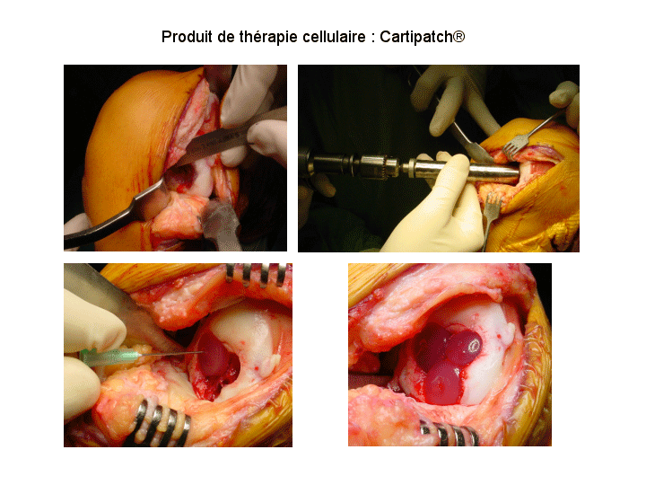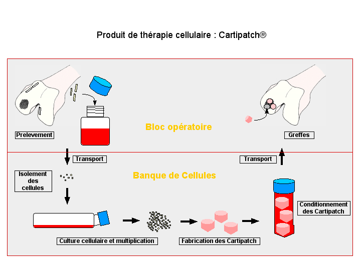 - Ce même principe est amélioré, en cultivant les cellules cartilagineuses sur une matrice 3D (TBF, banque de tissus, Produit de thérapie cellulaire : Cartipatch®) ce qui facilite la manipulation des cellules, évite la suture du périoste et permet une approche sous arthroscopie. Les résultats sont en cours de validation.