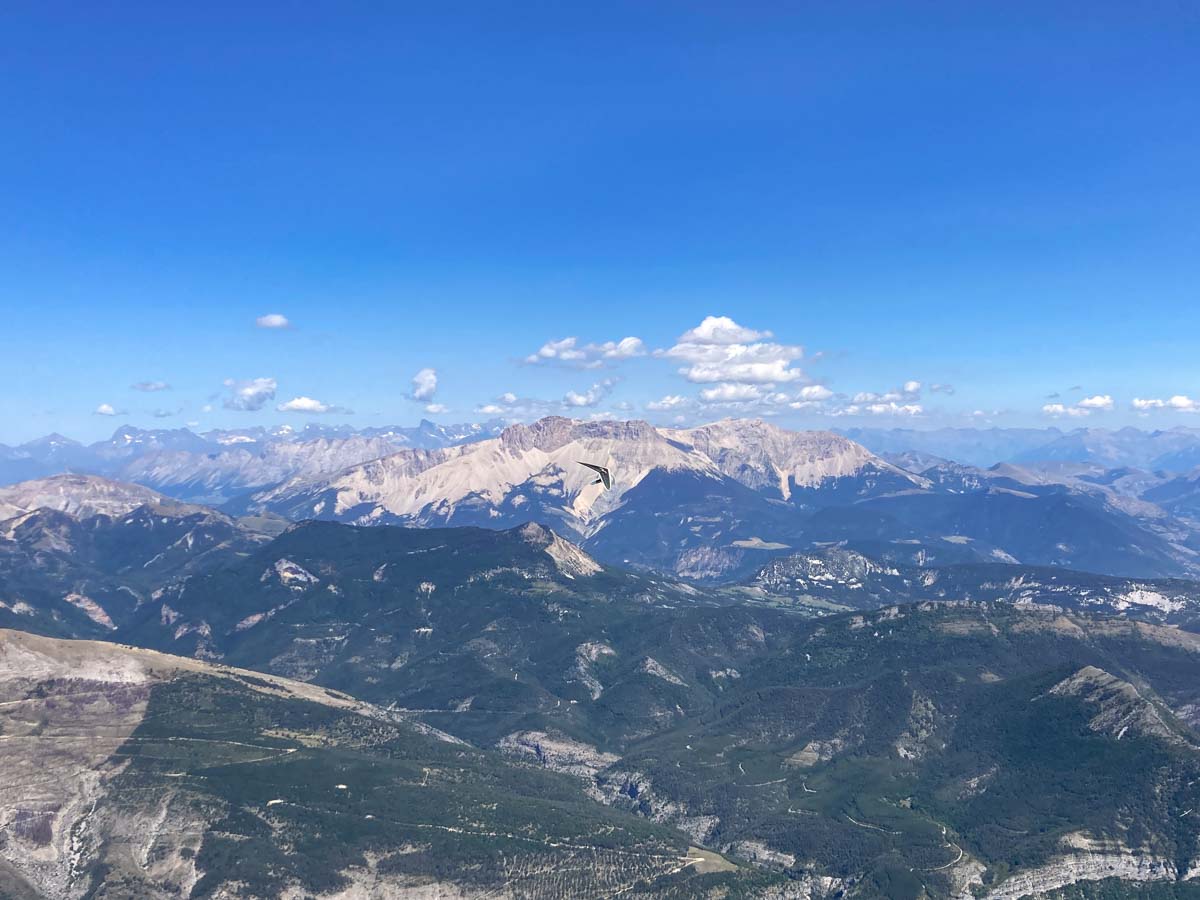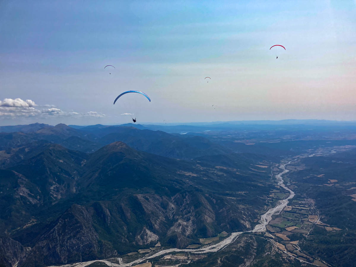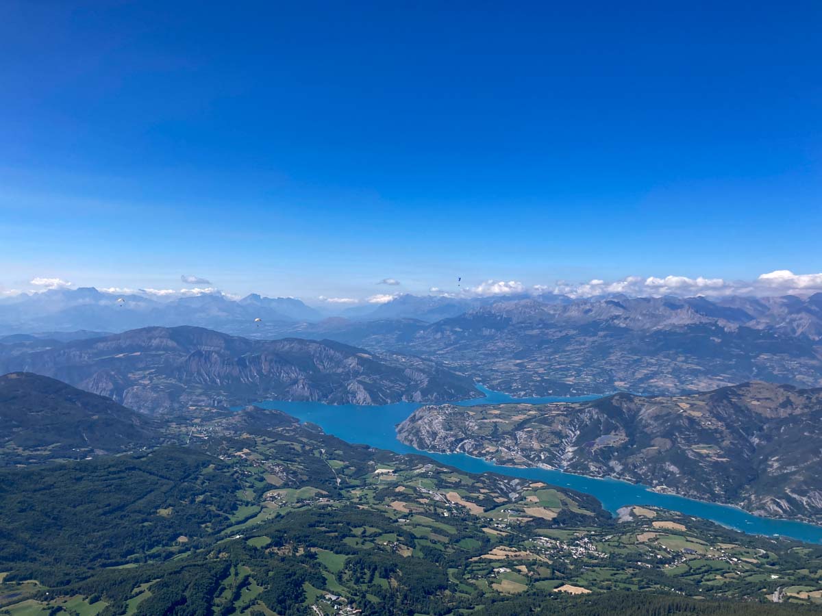Aujourd’hui c’est une course au but de 77 km vers Chorges depuis le déco de Chabre. C’est donc plus ou moins le parcours que nous avions fait en allant au Pic de Bure mais au lieu de rentrer sur Laragne on continue vers l’est en direction du lac de Serponçon. Le gagnant de cette manche, Justin Puthod (fils de…) boucle en 2h 04 à plus de 37km/h de moyenne, Alfredo le Warrior de l’équipe boucle en 2h 54 et se classe 17ème et je boucle en 3h 26 avec mon aile en B à la 25ème position. JJ et Émilio posent presque ensemble à l’avant dernière balise.