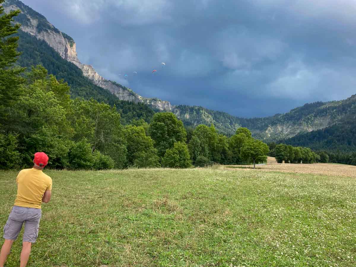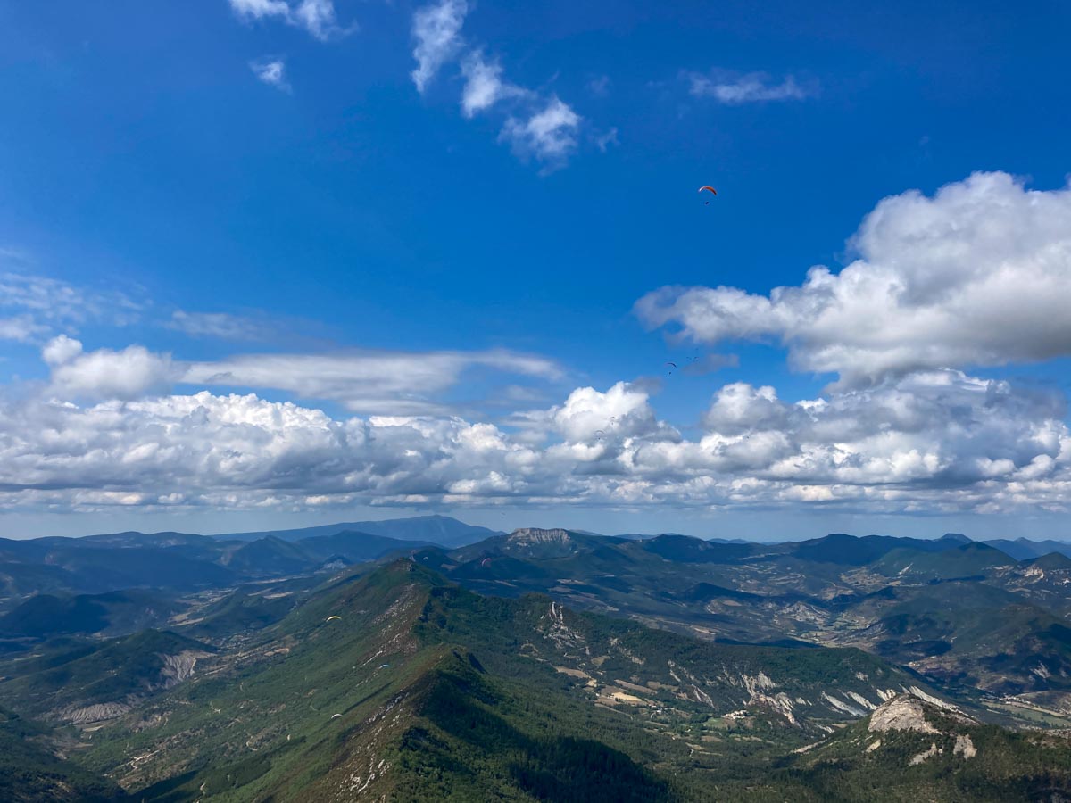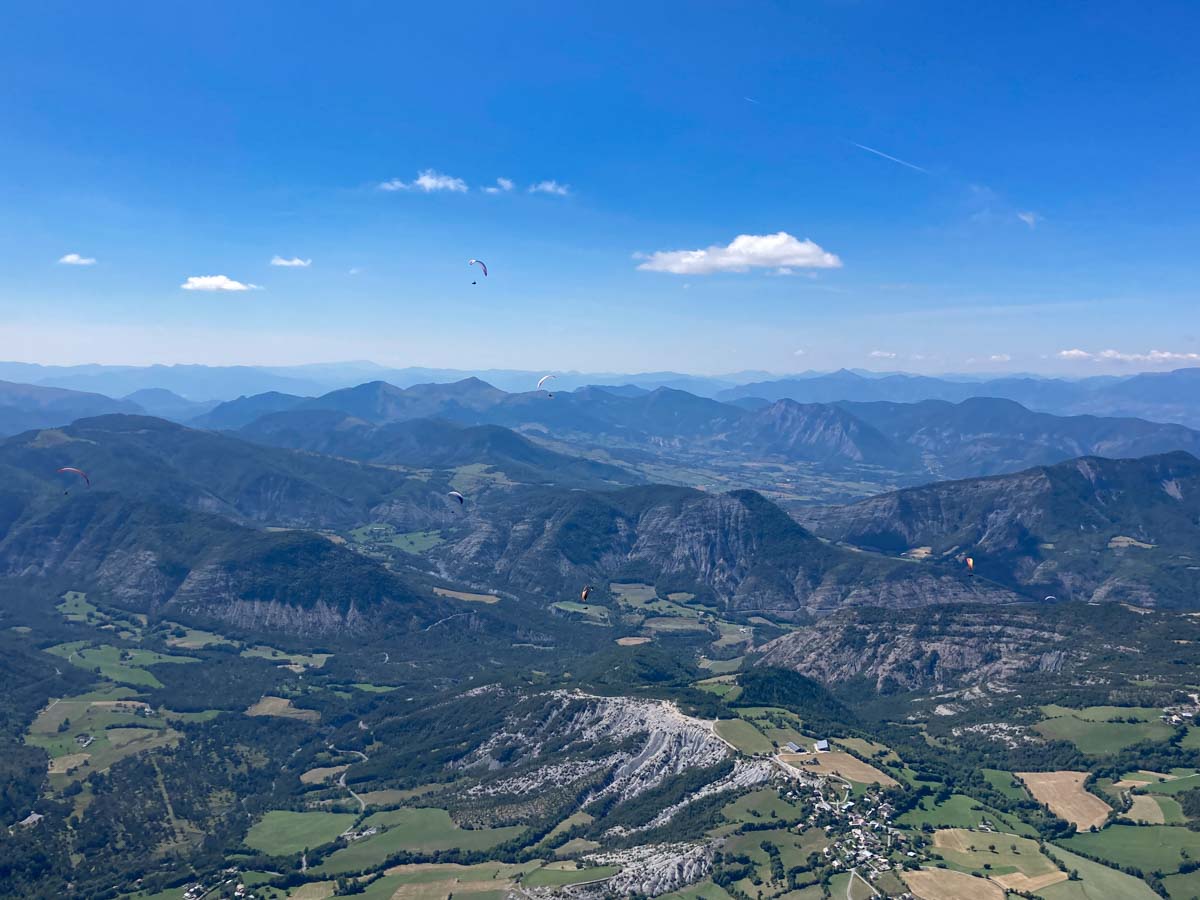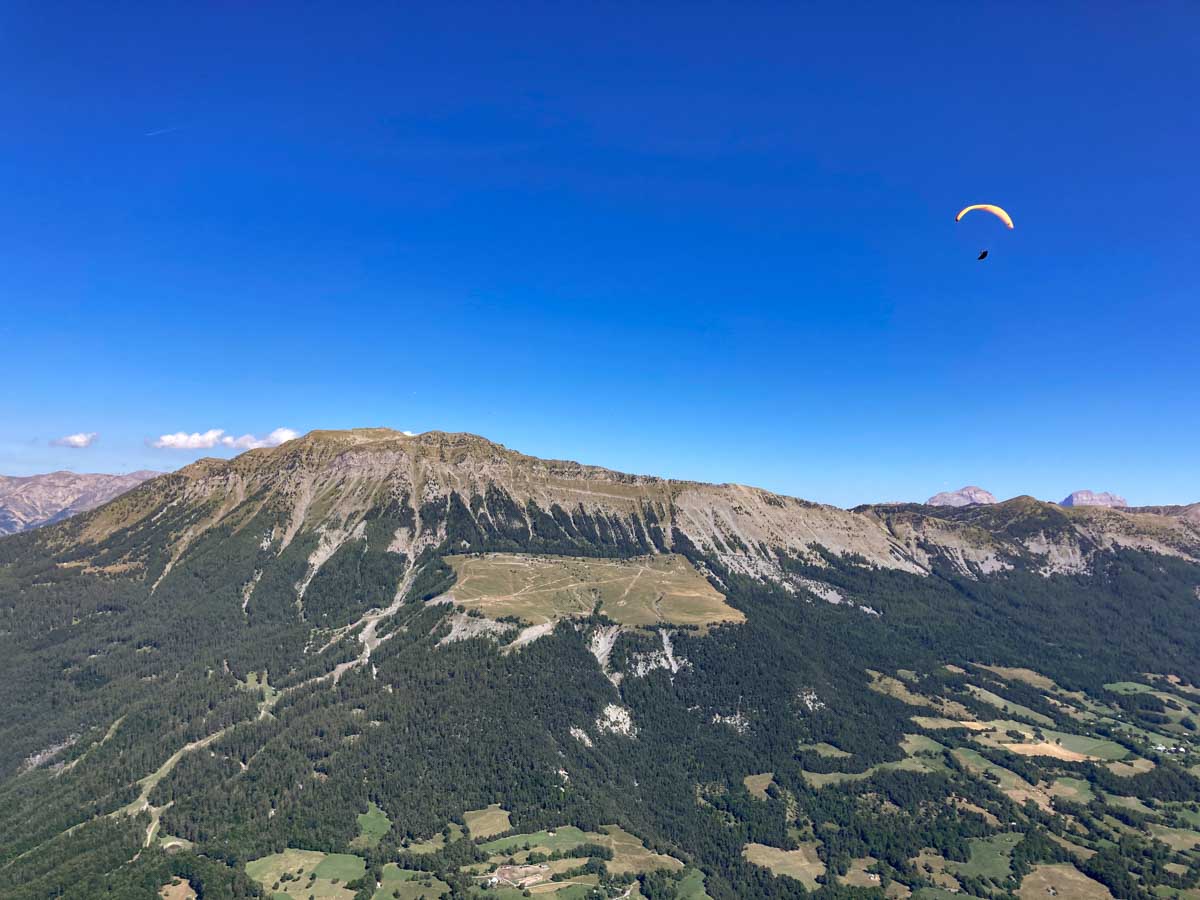 Pierre Laurens décide de lancer une manche depuis Courtet car le nord sera trop fort pour voler à Laragne. C’est une petite manche entre le Grand Ferrand et le Chatel avec, pour finir, une balise au Jocou avant de poser à l’atterro de Courtet. Le vol a à peine commencé que je commence à recevoir des gouttes de pluie… je décide d’aller me poser suivit par quelques pilotes dont JJ et Émilio. Personne n’atteindra le Jocou et les premiers poseront à Lalley (un atterro que certains membres de notre club connaissent bien…).