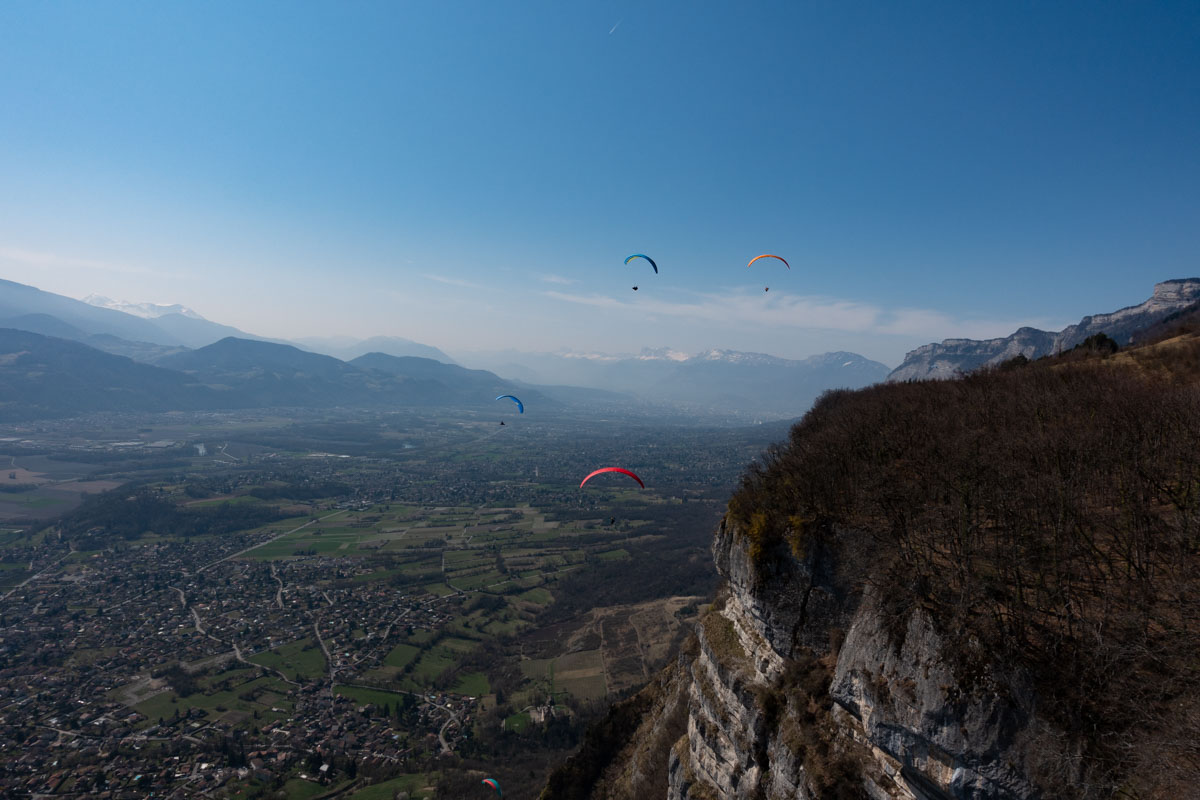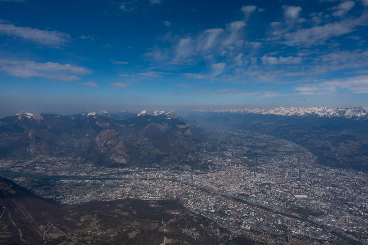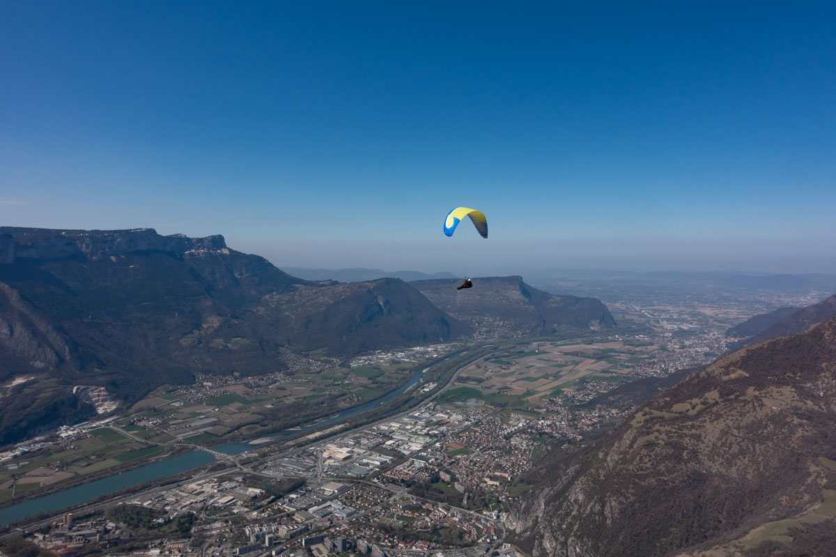 De l’autre côté c’est déjà la foire d’empoigne. Il doit bien y avoir une trentaine d’ailes à fighter pour un bout de thermique et ça continue à arriver… Je fait un point bas à 500 m, les autres ne sont pas beaucoup plus haut. Enfin le cycle démarre et nous passons au dessus des lignes à 960 m… On progresse sur le plateau de St Nizier vers le Moucherotte, on enroule tout ce qu’on trouve en nous demandant à chaque instant si on ne ferait pas mieux de dégager avant de nous faire enfermer derrière ces satanées lignes. Finesse max pour essayer de raccrocher dans le thermique du Moucherotte qui est, comme tout bon thermique, complètement sous le vent de la brise… Là ça va un peu mieux, ça commence à monter plus régulièrement, on est moins nombreux, on a plus de place pour tourner. Finalement je sors sur la crête et j’attends Laurent qui ne tarde pas à me rejoindre. Ça sera d’ailleurs la seule fois que je l’attendrais. On fait le plein et on avance vers le sud.