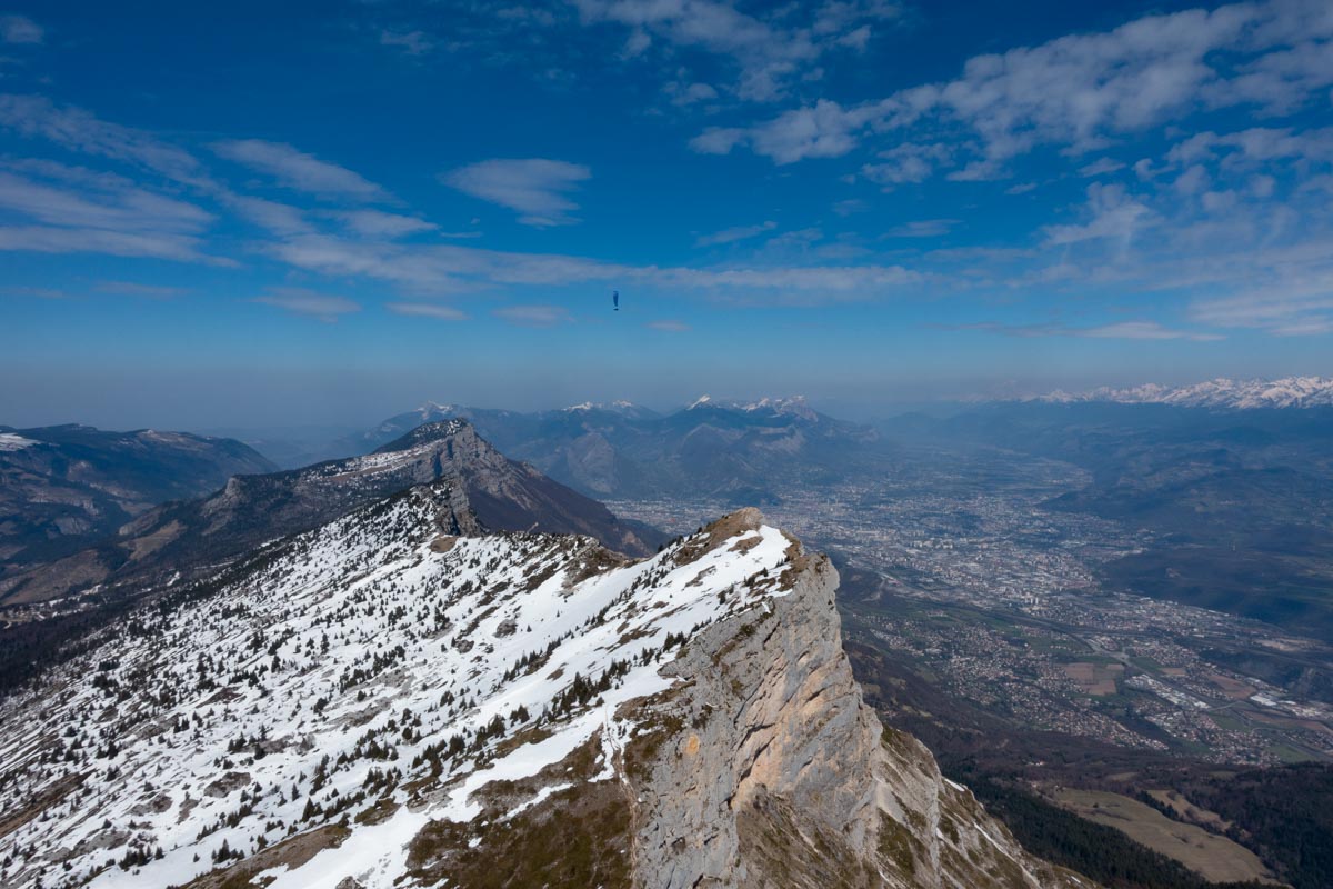 On arrive au Rachais après 45mn de vol tonique et là le groupe se désagrège. Laurent traverse sur le Néron le premier et nous attends à 1300 m pendant un bon moment. Finalement on est 4 à 1350 m et on s’élance dans la transition vers le Vercors.