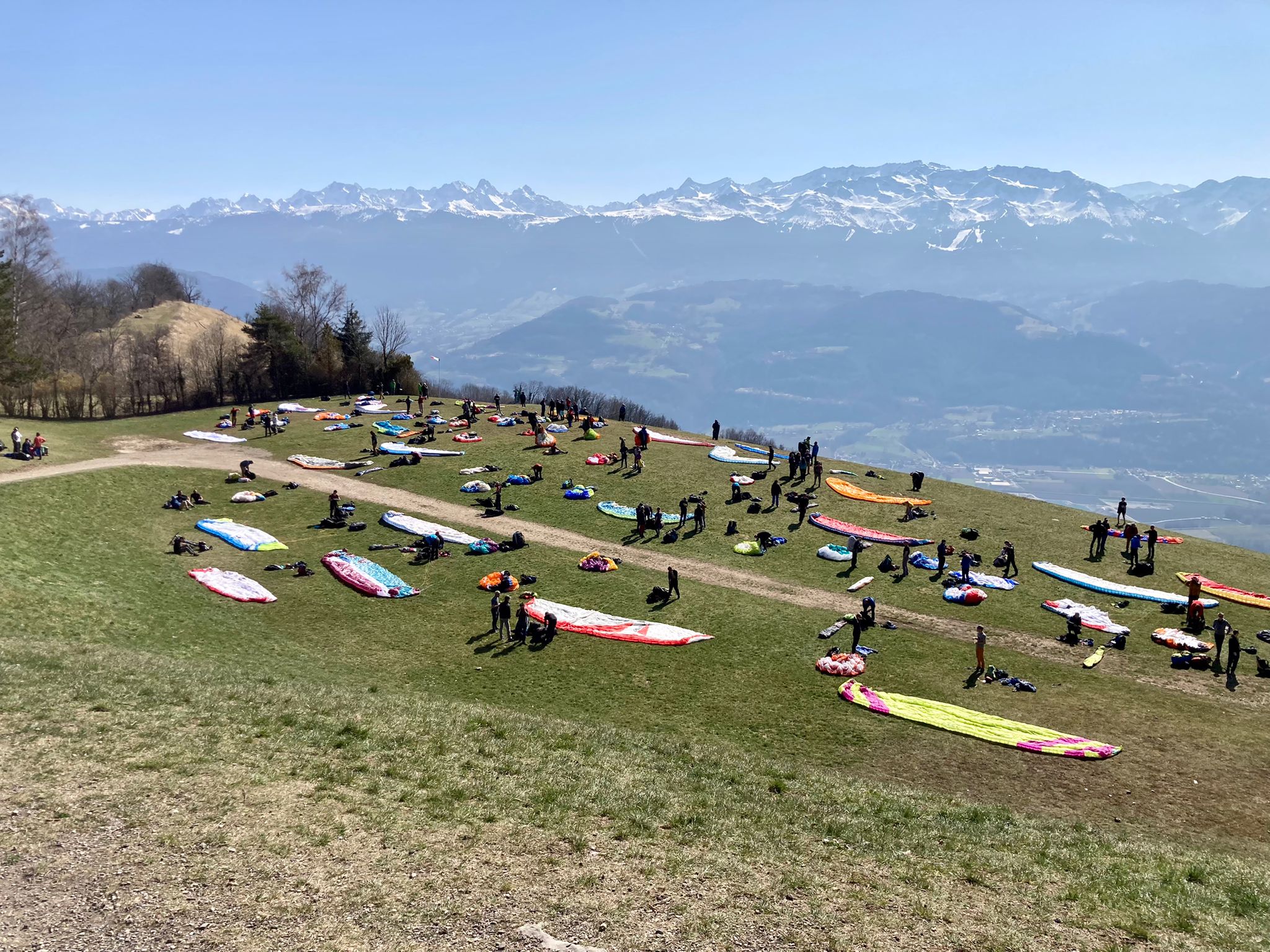 De l’autre côté c’est déjà la foire d’empoigne. Il doit bien y avoir une trentaine d’ailes à fighter pour un bout de thermique et ça continue à arriver… Je fait un point bas à 500 m, les autres ne sont pas beaucoup plus haut. Enfin le cycle démarre et nous passons au dessus des lignes à 960 m… On progresse sur le plateau de St Nizier vers le Moucherotte, on enroule tout ce qu’on trouve en nous demandant à chaque instant si on ne ferait pas mieux de dégager avant de nous faire enfermer derrière ces satanées lignes. Finesse max pour essayer de raccrocher dans le thermique du Moucherotte qui est, comme tout bon thermique, complètement sous le vent de la brise… Là ça va un peu mieux, ça commence à monter plus régulièrement, on est moins nombreux, on a plus de place pour tourner. Finalement je sors sur la crête et j’attends Laurent qui ne tarde pas à me rejoindre. Ça sera d’ailleurs la seule fois que je l’attendrais. On fait le plein et on avance vers le sud.