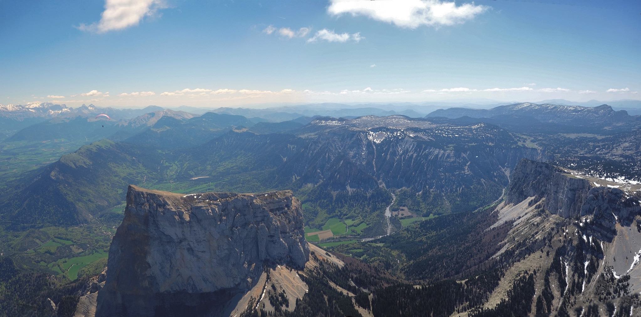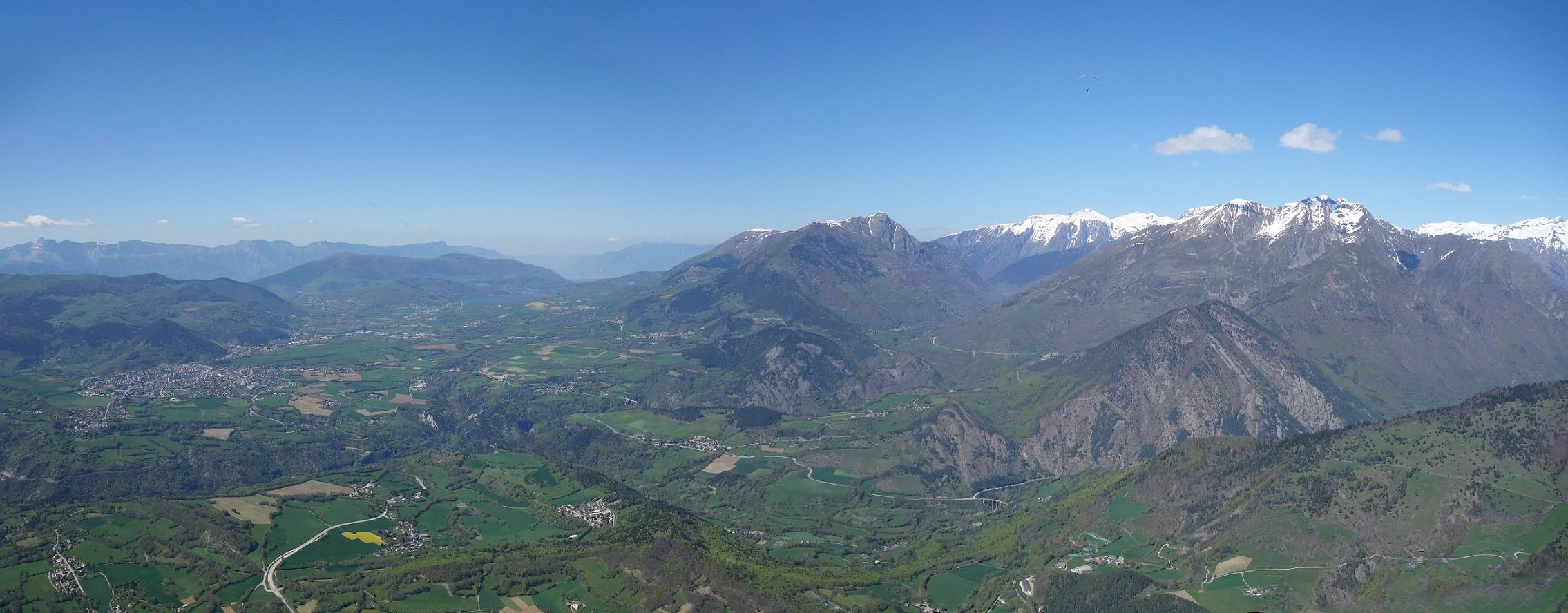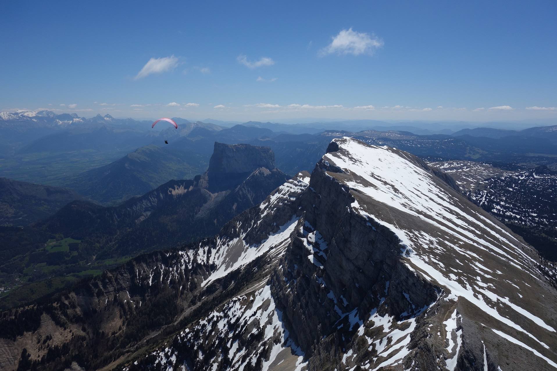 Sur une idée de Jean-Marc on se retrouve au col de Comboire vers 10h ce mercredi 3 mai 2023. Il est accompagné de Fabien, un ancien Deltiste qui évoluait en Équipe France et qui s’est mis au vol rando. Nous montons au déco du Peuil, une première pour JM et moi-même. Déco magnifique, bien alimenté, plein est, il est 11h, 3 voiles qui ont décollé du Moucherotte nous passent dessus. 11h 20, on envoie la pâtée ! On part direct à droite vers le sud, JM sous sa Savage, Damien sous j’ai oublié quoi mais pas une aile perf et moi sous ma fidèle Alpina 4. On connait le cheminement pour l’avoir souvent fait quand on vient de St-Hil. D’ailleurs plusieurs guns arrivent de Chartreuse et nous dépassent. Notre plan c’est : Grand Veymont – Jocou – Grand Ferrand – Tête de l’Obiou – Coiro – Taillefer – Chamrousse et final glide vers Comboire. Mais pour l’heure ça ne se passe pas encore trop bien. On se retrouve à au-moins 10 ailes au fond de la combe qui monte de St-Paul de Varce, juste avant de passer le col qui mène à Prélenfrey, sous le Cornafion et ça ratasse. Il y a ceux qui ont décollé du Moucherotte et ceux qui ont traversé depuis le Néron. Je fais demi-tour pour me mettre en attente vers le déco du Pré du Four. JM qui est resté avec le groupe m’annonce à la radio que ça commence à sortir. Nous passons la crête au niveau des 2 sœurs, on avance vers le Grand Veymont. Les guns qui sont sortis, un peu avant nous, reviennent déjà, c’est l’autoroute sur les crêtes du Vercors, spectacle époustouflant. Chaque thermique est balisé par des barbulles qui disparaissent au grés des cycles. On discute avec les pilotes du CHVD, en semaine itinérante, qui ont décollé du col du Noyer. Gilles est très bavard, j’entends plus mon vario… Ça monte à 2600 m au Grand Veymont, la vue sur le Trièves est imprenable. je vous passe la description des champs jaunes de colza et des paries au vert éclatant de ce début de printemps, sans oublier le bleu des lacs… c’est pas mon truc. Nous continuons vers le Mont Aiguille qu’on longe (survol interdit) pour raccrocher les avants reliefs. On a perdu Fabien. J’apprendrai plus tard (il n’avait pas de radio) qu’il a posé près du Serpaton où il compte bivouaquer et rentrer à Grenoble le lendemain. J’arrive au Jocou avant JM qui peine en basses couches alors que je suis toujours à 2500 m. Je traverse le col de la Croix Haute, je raccroche le Mesnil et son fameux thermique en face sud re 2500 m. Transition sur les contreforts de l’Obiou. JM m’annonce qu’il s’en est sorti et qu’il va vers le Grand Ferrand. J’y arrive un peu avant lui et je l’attends en tournant avec un delta au-dessus du sommet. Je suis à 2700 m, il est 15h on vole depuis 3H 30, je commence à avoir faim et j’attends la transition vers le Coiro avec impatience pour pouvoir lâcher les commandes et terminer mon sandwich. JM fini par monter et me rejoint à la Tête de l’Obiou. Nous sommes presqu’à 2800 m et on frôle la base des nuages. 2860 m j’ai la tête dans les barbules mais les pieds dépassent encore un peu. Feu sur le viaduc de l’autre côté de la vallée et le Chauvet où je touche le premier thermique quand j’avale la dernière bouchée de mon casse-croûte. Je commence à enrouler et JM arrive très bas derrière. Je m’avance sur les pentes du Coiro et là je choisi le mauvais point de raccrochage (pour une fois l’Oudie m’a enduit d’erreur en affichant une belle tâche rouge sur la carte là où je ne trouve rien !) et je vais rester un bon moment à zoner au niveau du décollage du Jas d’Oris pendant que JM trouve une bombe qui le monte à plus de 3000 m ! Là-haut il y a déjà 2 ou 3 guns qui arrivent des Écrins. Je sors de mon mauvais pas et je rattrape mon partenaire au Taillefer. On transite ensemble sur Chamrousse où Il y a des pilotes du CHVD (Laurent et Guilhem). JM s’arrête au déco de l’Aiguille pour satisfaire un besoin pressant. Je décide de changer de plan et d’aller poser à St Naz pour retrouver Laurent pendant que JM tente le final glide vers Comboire et il le réussi ! Il pose à Claix près de la route qui le ramènera à sa voiture. 6h 20 pour 120 km dans une aérologie assez mouvementée (on apprendra que, ce jour-là, au moins trois pilotes se seront crashés en Chartreuse et dans le Vercors).
