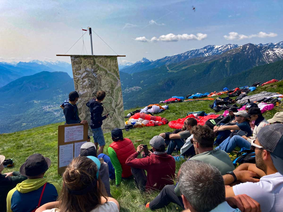 Les prévisions sont excellentes avec encore des plafs qui dépassent les 3000 m, la manche fait 46 km avec la traversée de la vallée de la Durance réputée pour ses brises soutenues (l’organisateur nous préviens : « Les atterros sont confortables, les conditions un-peu moins… »). On charge la manche, grâce au QR code envoyé par l’orga sur WhatsApp, sur les diverses applis (XC Track, SeeYou, FlySkyHigh…). L’ouverture de la fenêtre de décollage est à 10h 30 et le start à 11h 15. Ça laisse 45 mn pour s’acclimater.