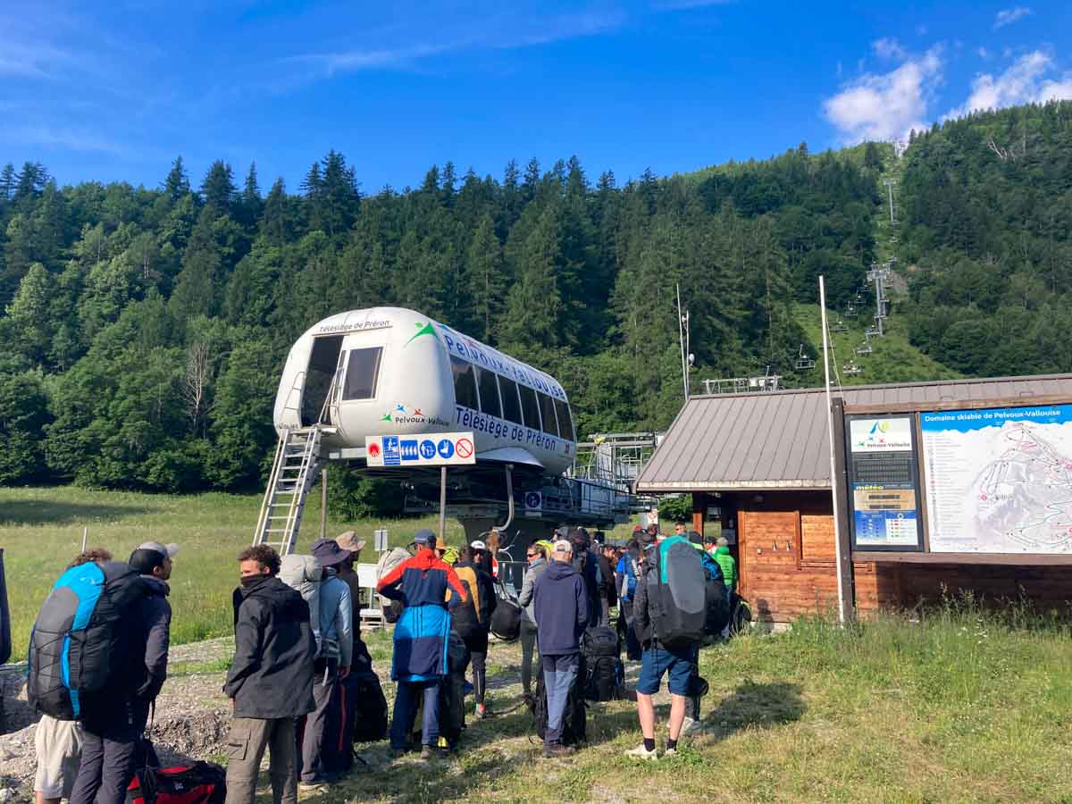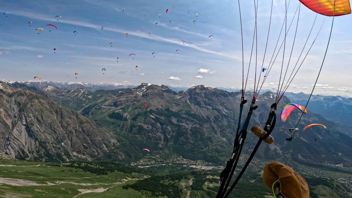 60 pilotes sont inscrits à la première manche. Cette année le déco se fait du sommet de la station de Pelvoux. On prend 2 télésièges non débrayables, on a le temps de discuter et d’admirer le paysage. Parce que moi, une fois en vol, j’ai plus-tôt tendance à regarder où je vais pour éviter les autres pilotes, en fin ça c’est au début, avant le start, parce qu’après je ne vois souvent plus personne, et pas parce que je suis devant…