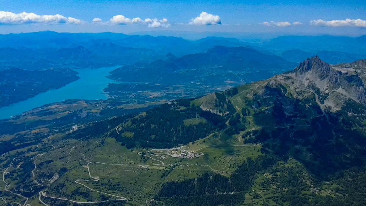Le lac de Serre-Ponçon depuis le Mont Guillaume. À droite, les Aiguilles de Chabrières