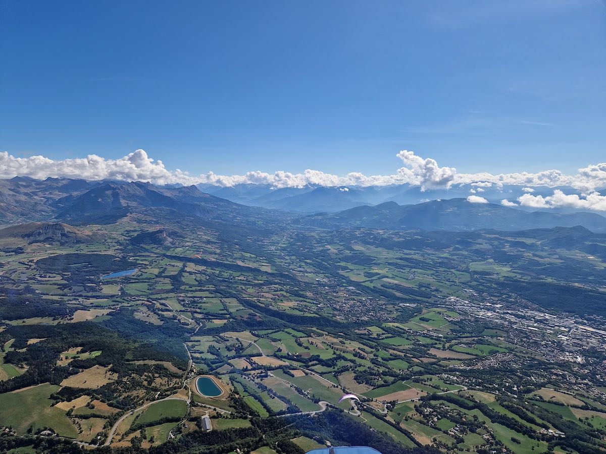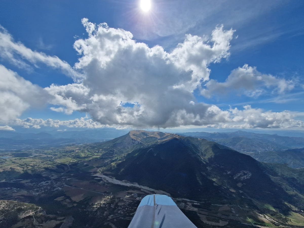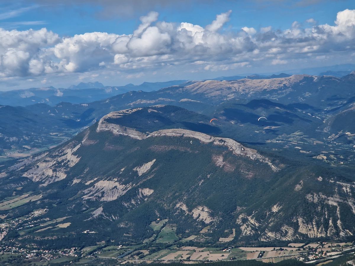 Grosse transition vers B2, Ceüse ; les premiers suivent le trait qui mène tout droit vers une zone complètement à l’ombre. Je n’y crois pas et j’oblique vers les faces Ouest qui sont au soleil. Bingo, pendant que les autres ratassent dans leur trou, je fais le nuage avec une zeolite qui mène le bal et qui a réagi assez vite pour se sortir du traquenard. Nous partons vers Aspres et après quelques minutes je pers le gun de vue. Je ne le reverrai qu’à l’atterro !