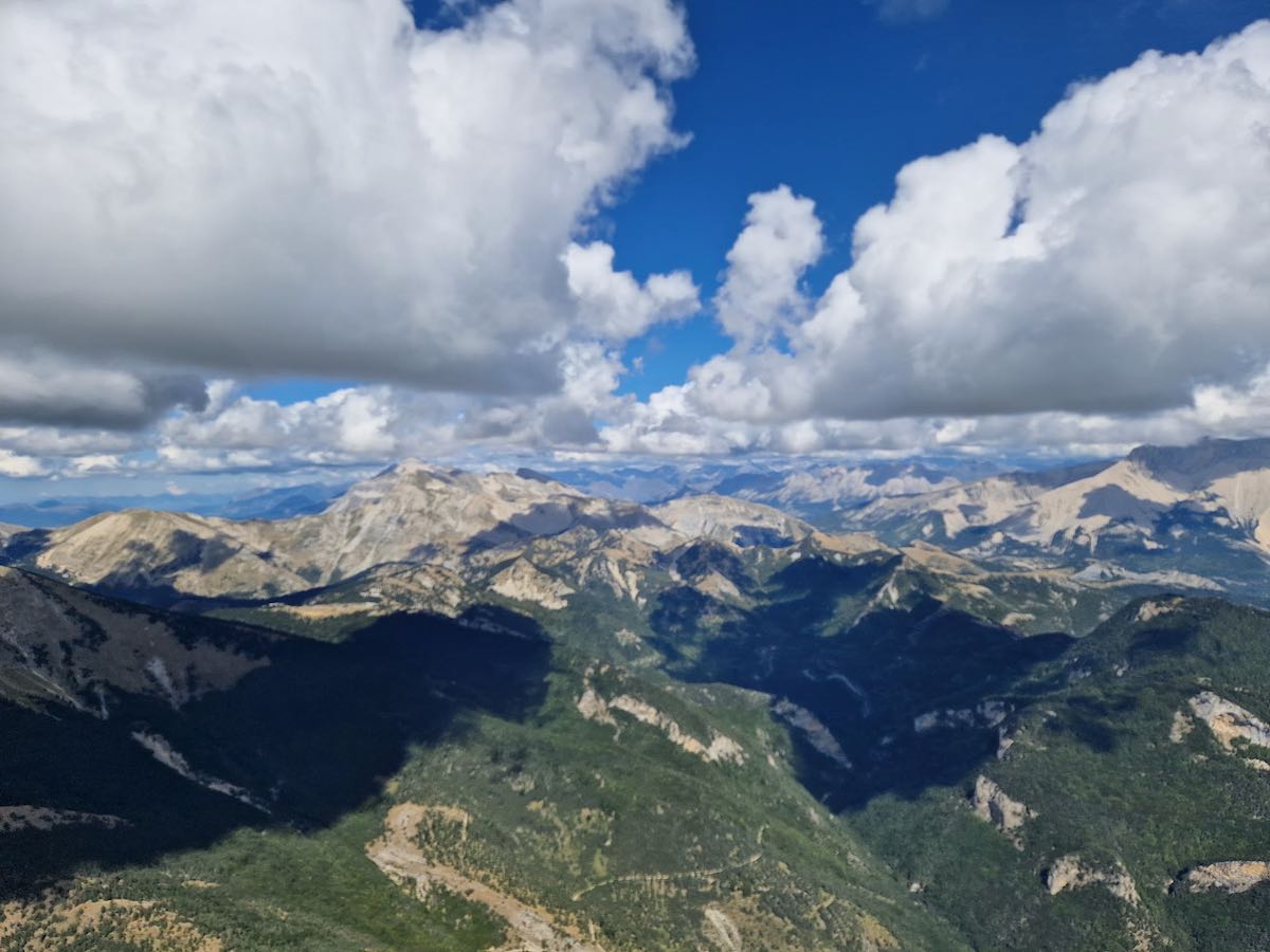 À partir de là, ça se complique, on commence à sentir l’influence du Sud (ce que n’avait pas prévu l’orga …) Le pilotage devient technique car il faut choisir entre avancer en dérivant ou monter dans des thermiques qui décalent et nous éloignent de la balise qui est encore à 4 km face au vent. On est maintenant plusieurs au-dessus du d’éco d’Aspres à essayer de monter suffisamment pour partir vers B3 mais à chaque fois on s’éloigne de la balise… Finalement je décide, une fois de plus de forcer le passage et je pars aussi haut que je peux, c’est-à-dire bas ! Là ce ne sont pas les atterros qui manquent mais justement, pas vraiment en vie de poser. Et curieusement ça porte, les autres pilotes m’emboitent le pas et j’ai la surprise de découvrir que Jef est déjà sur place (il a choisi la voie rapide, un tout droit depuis Ceüse et a coiffé tout le monde au poteau !). Retour au-dessus du déco d’Aspres, la prochaine balise, c’est le Grand Ferrand, plein Nord, vent de cul donc. Je connais bien ce cheminement pour l’avoir fait de nombreuses fois en Delta et en Parapente. Rein de compliqué, faut juste être haut parce qu’avec les 15-20 km/h qui poussent ça peut vite devenir turbulent quand on arrive à la montagne de Durbonas. Donc j’assure le max sur Aspres (2738 m en me laissant décaler au Nord-Ouest).