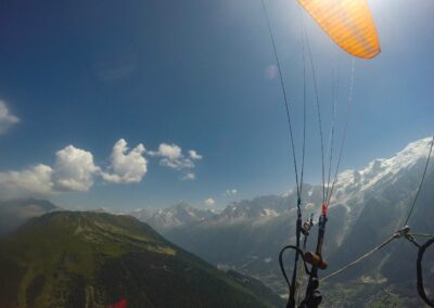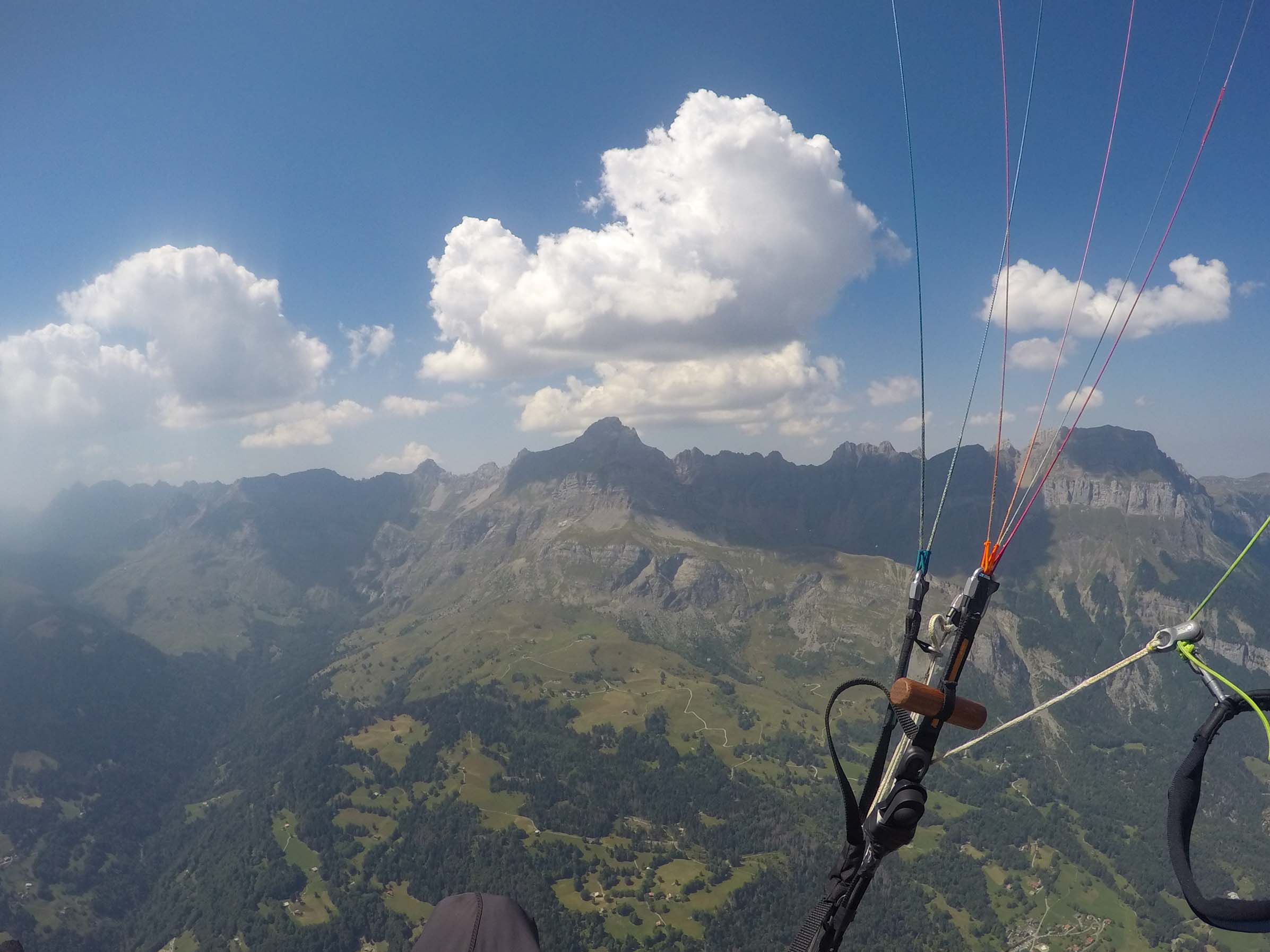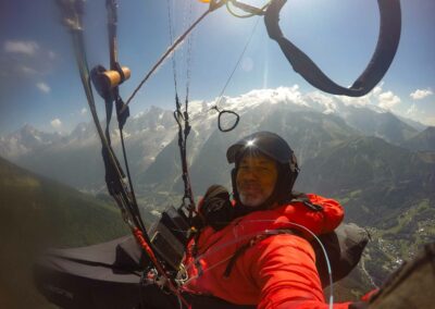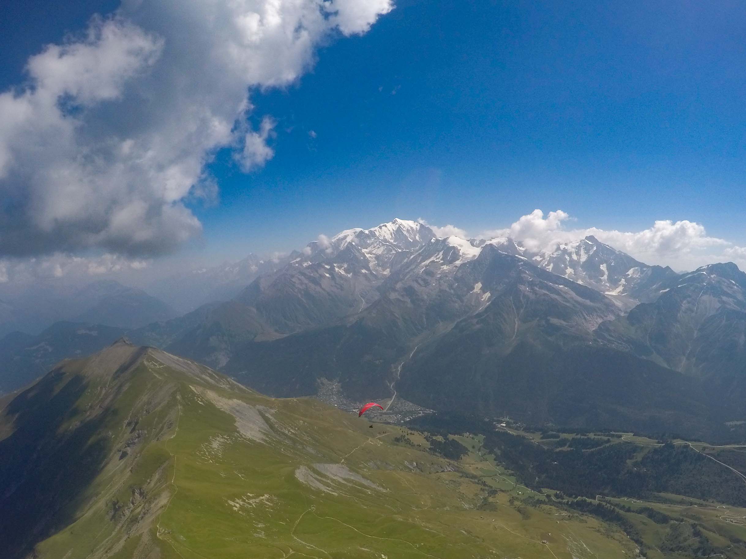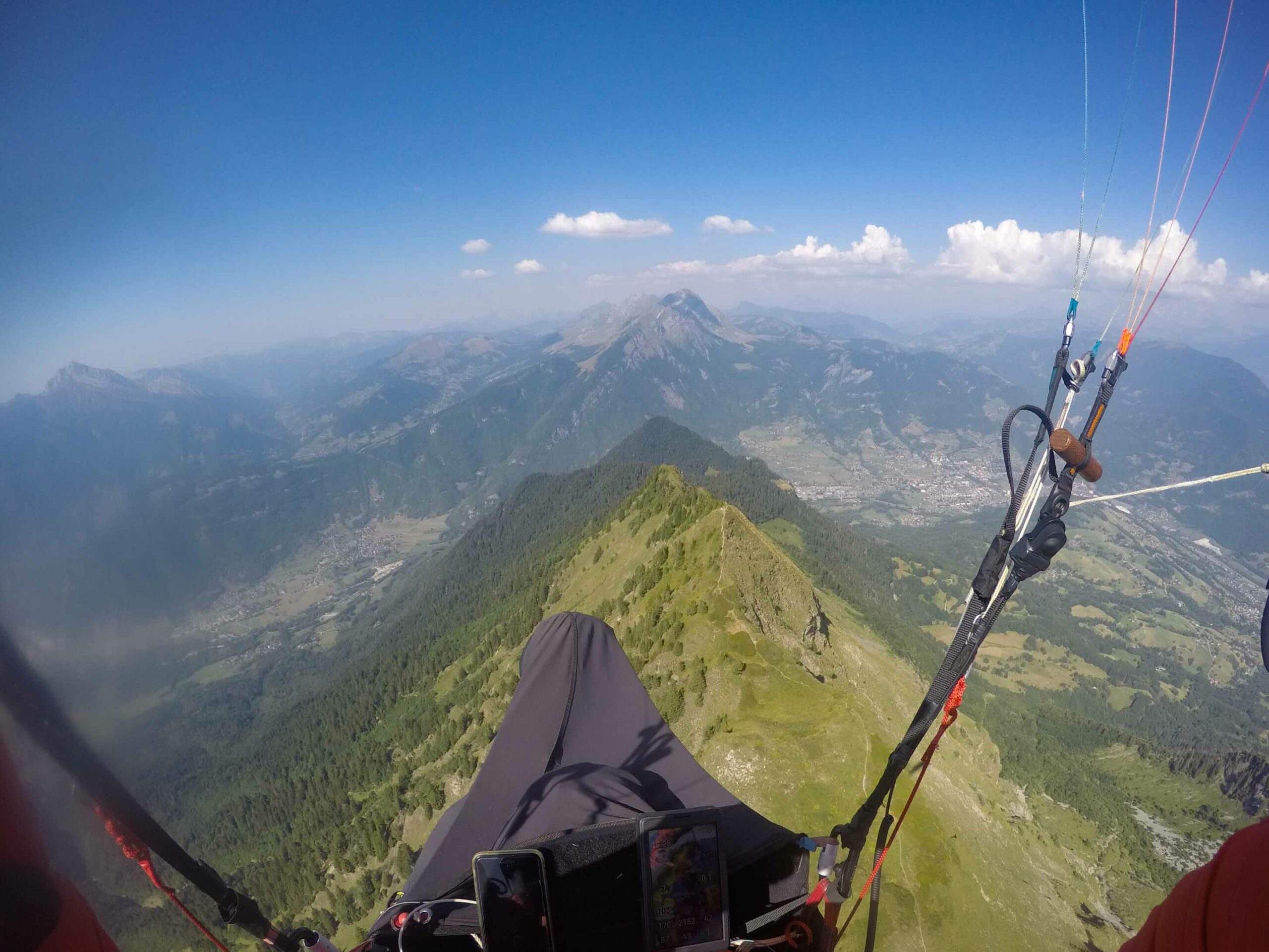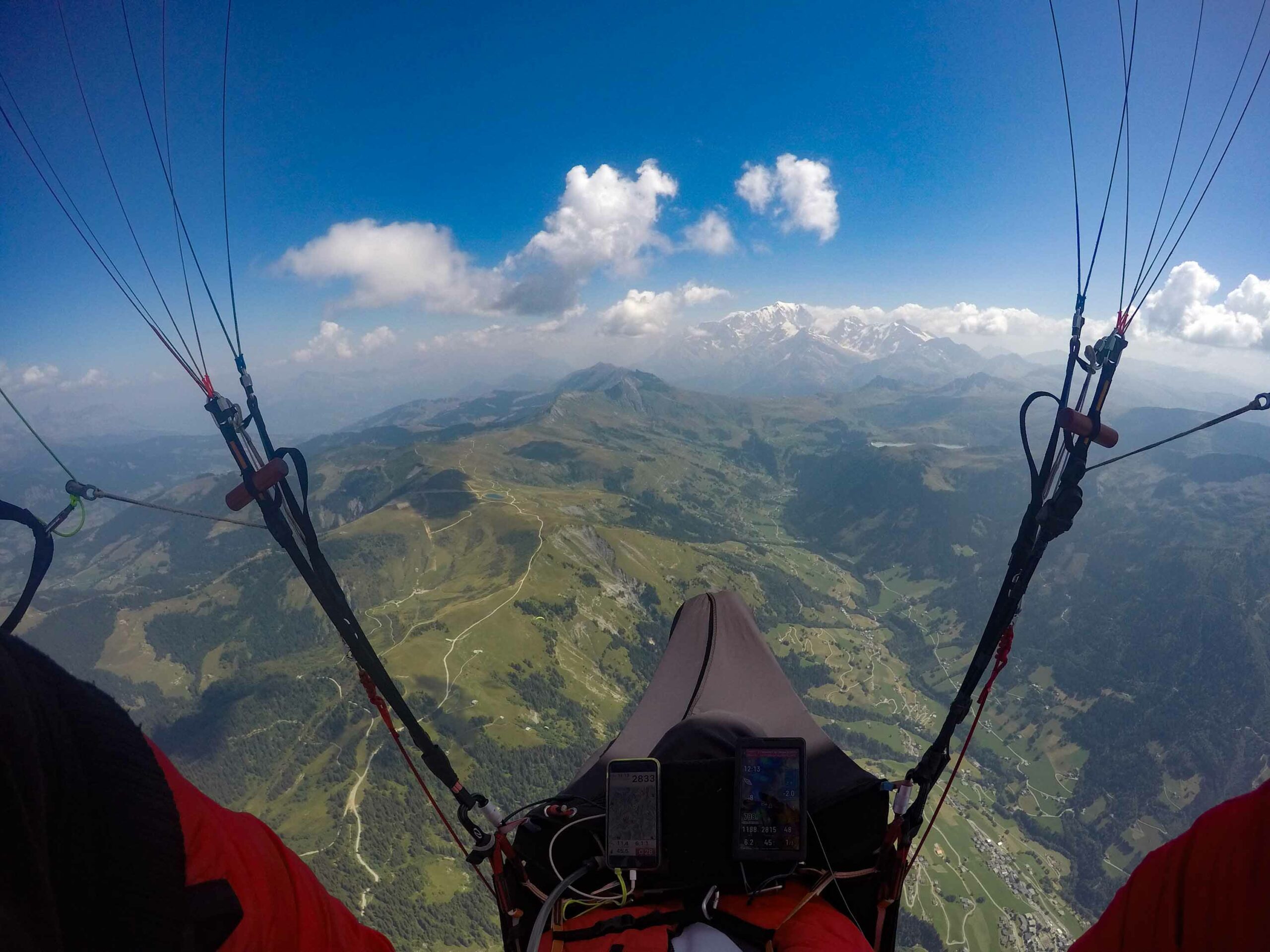 Au Mont Joly, nous sommes au nuage à 3 000 m. Les conditions sont encore bonnes… mais ça ne va pas durer. À le raccroche au Brévent, ça se complique : le paysage est splendide, mais la canicule transforme les thermiques en monstres, mêlés à une brise dantesque. Raccrocher est un vrai rodéo ! Je connais l’endroit : je m’attends à souffrir. Finalement, je sors au-dessus du Brévent à 3 100 m, en compagnie de deux biplaces. Pensée émue pour leurs passagers !