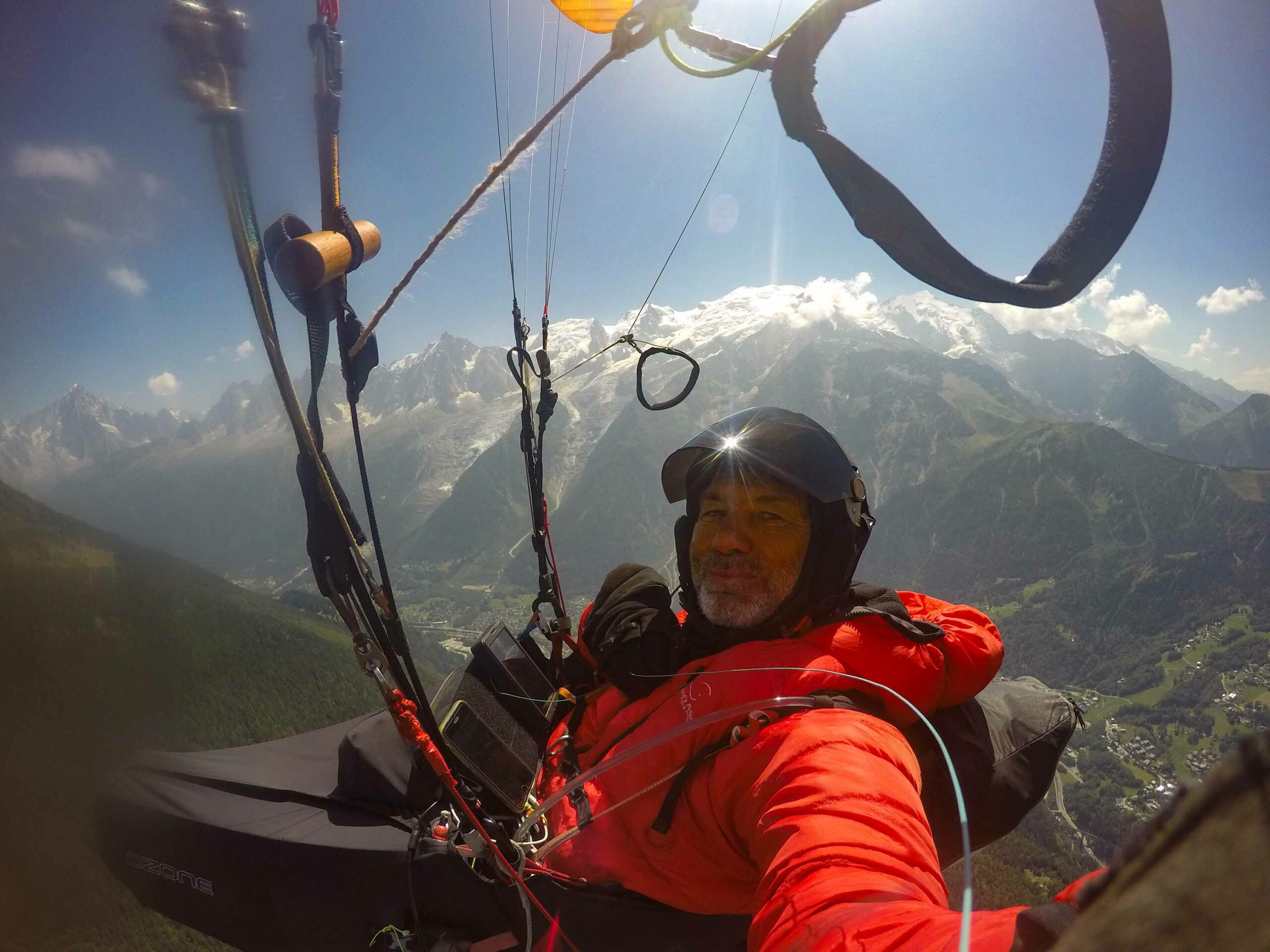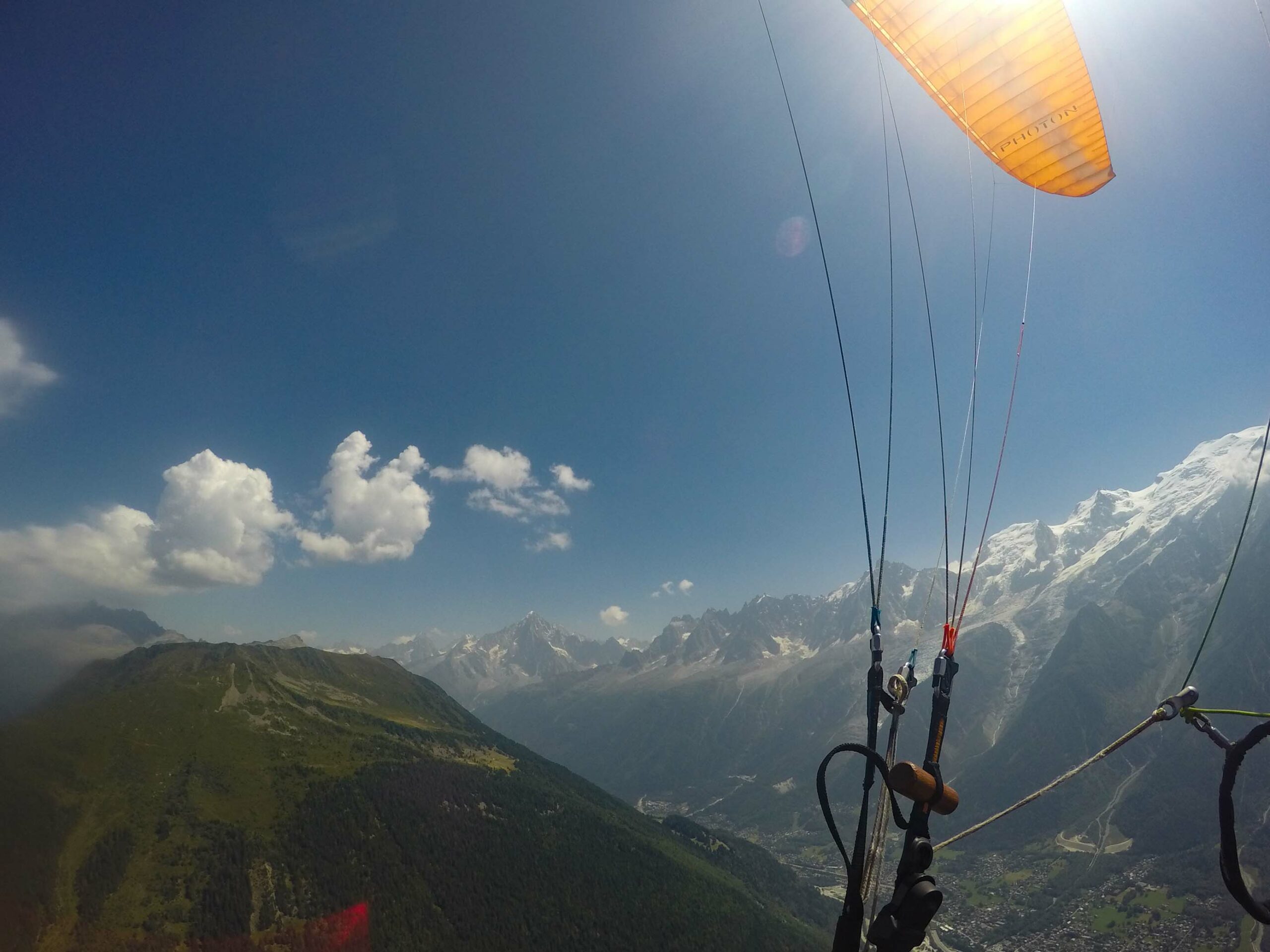 À 11 h 45, profitant d’une accalmie, je décolle. Montée express jusqu’au plafond : C’est le thermique, aidé par la tendance ouest, qui inverse les biroutes. Direction Chamonix ! Mes deux acolytes me suivent peu après. JJ me rattrape à l’Aiguille Croche ; Paul, lui, reste deux ou trois thermiques derrière.