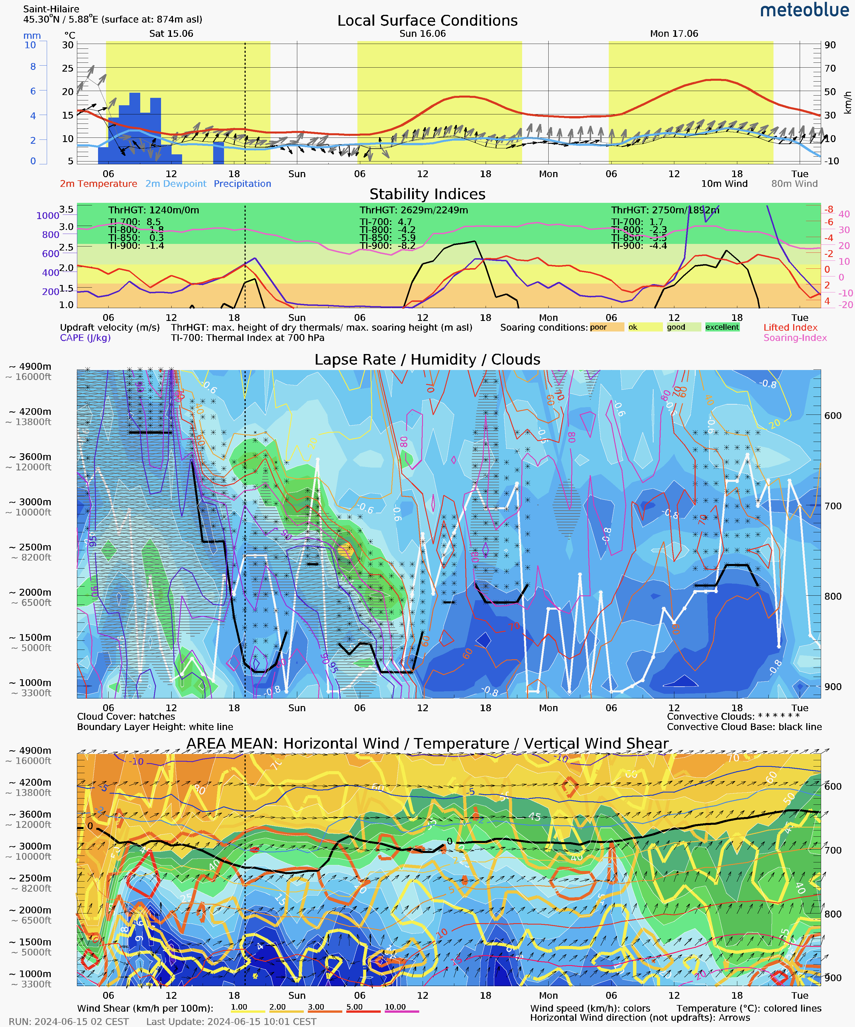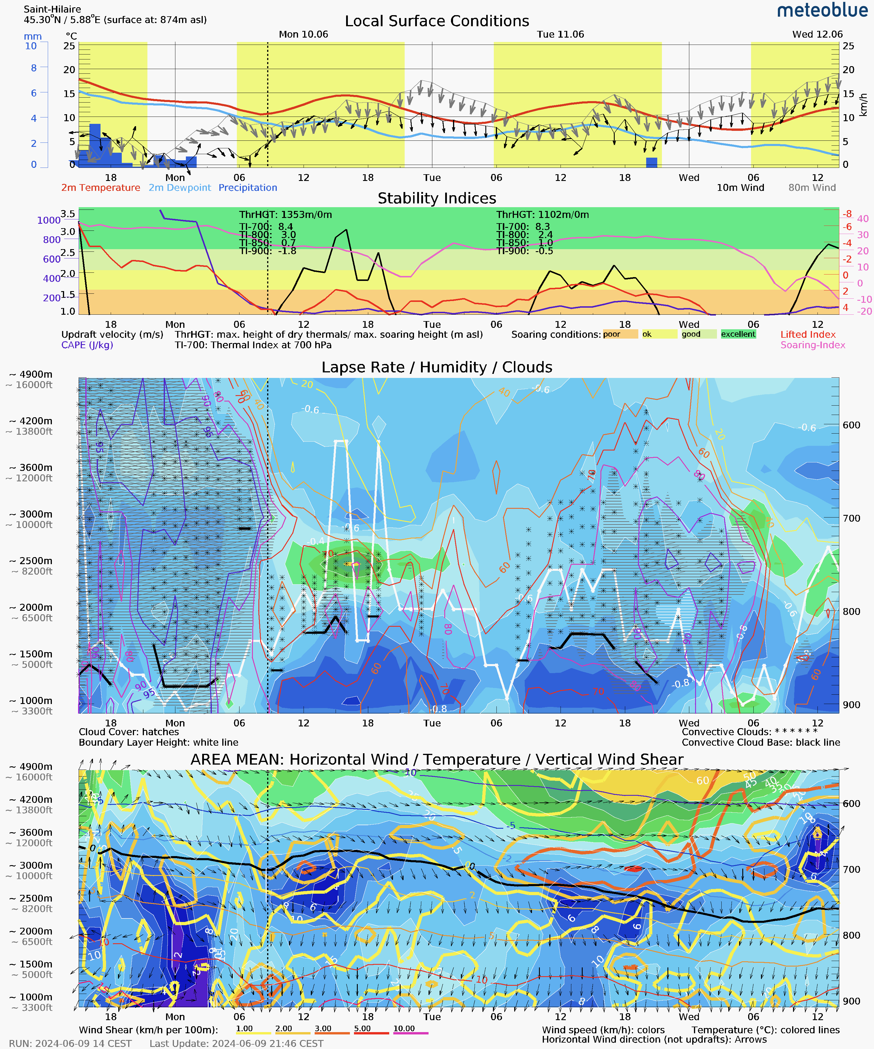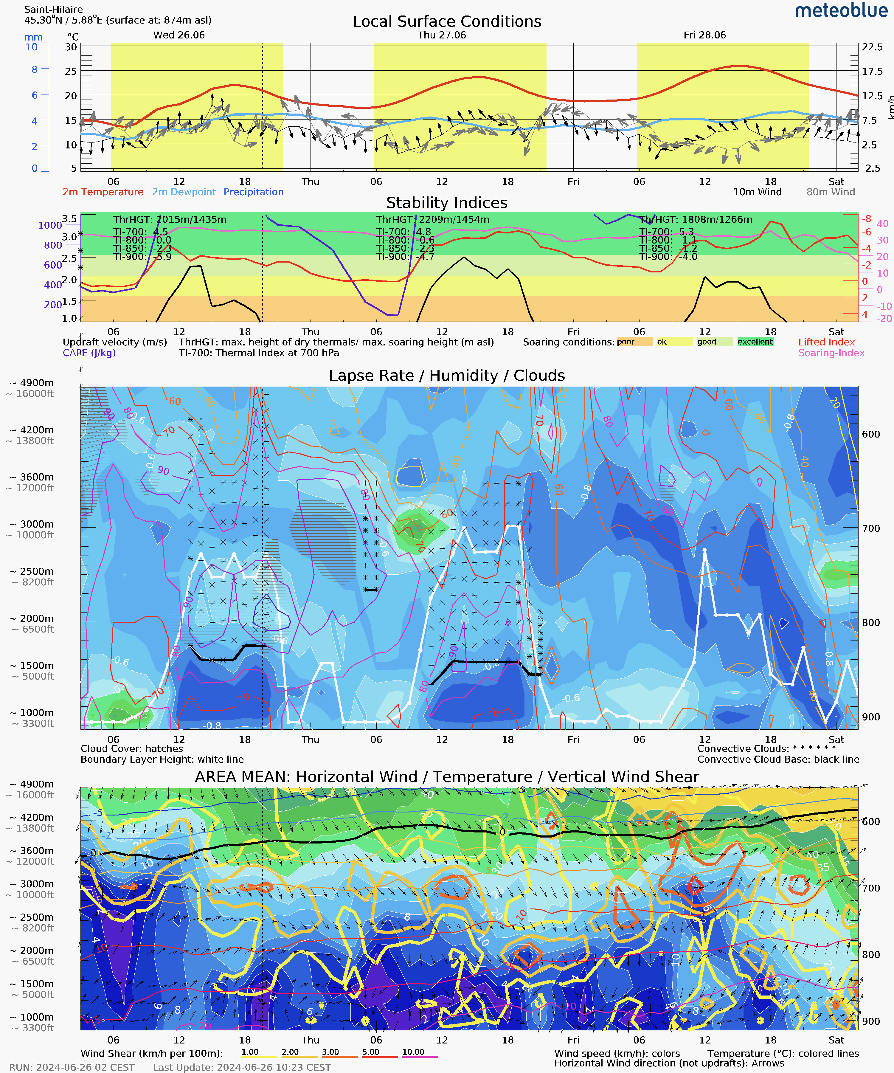 C’est une journée volable avec des plafonds qui dépasseront 2000 m mais le voile prévu vers 15h diminue fortement la possibilité de Cross.