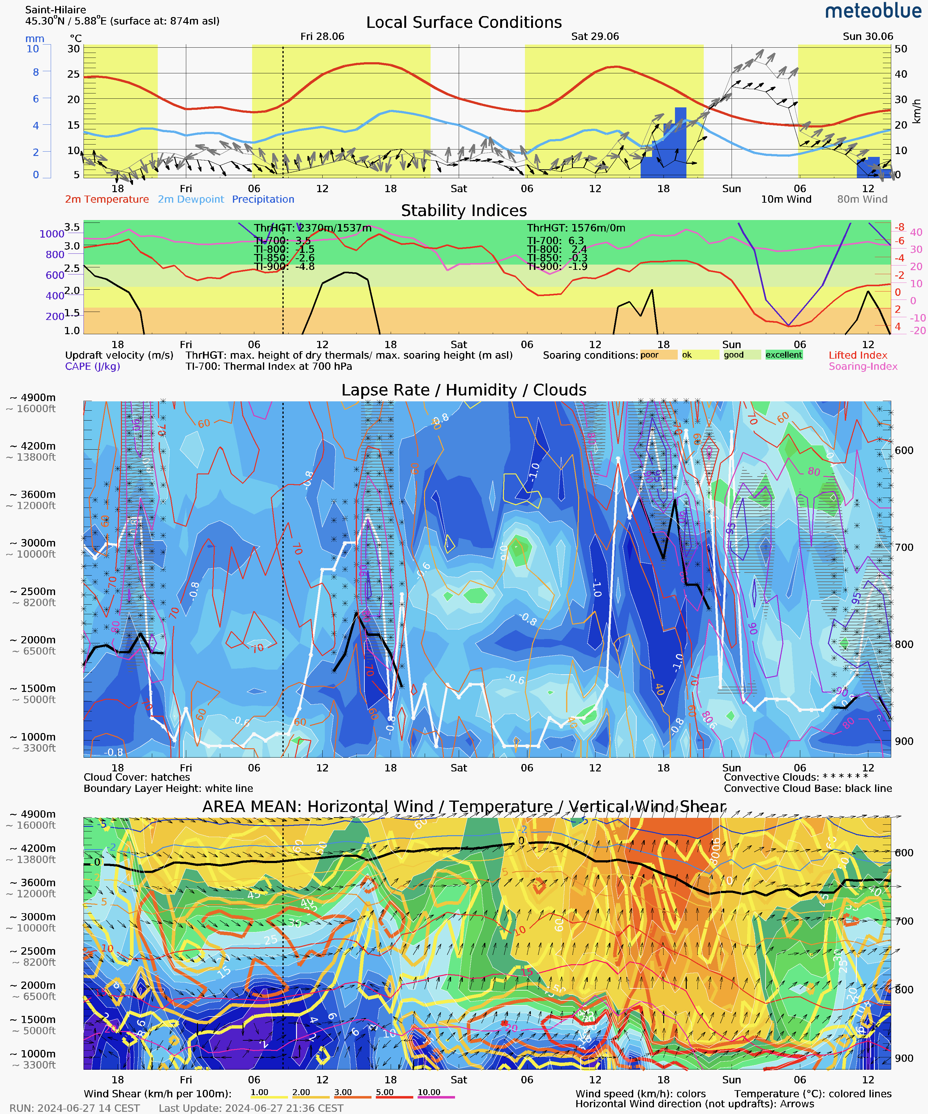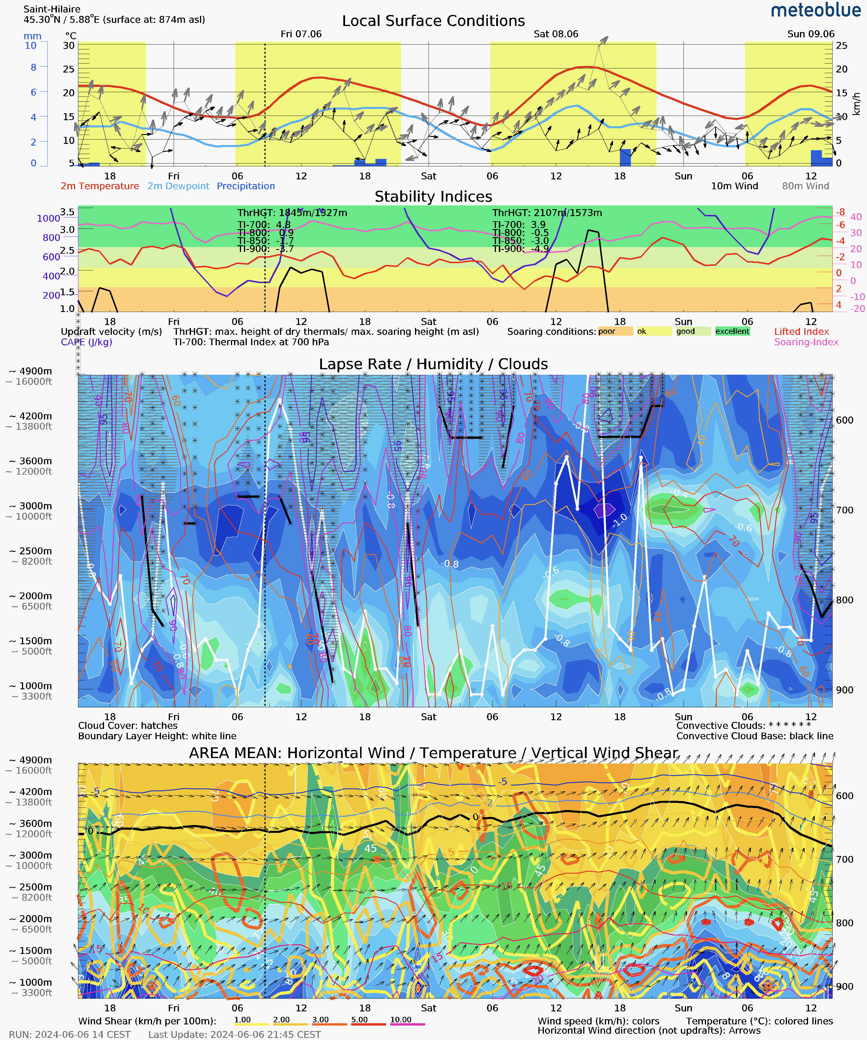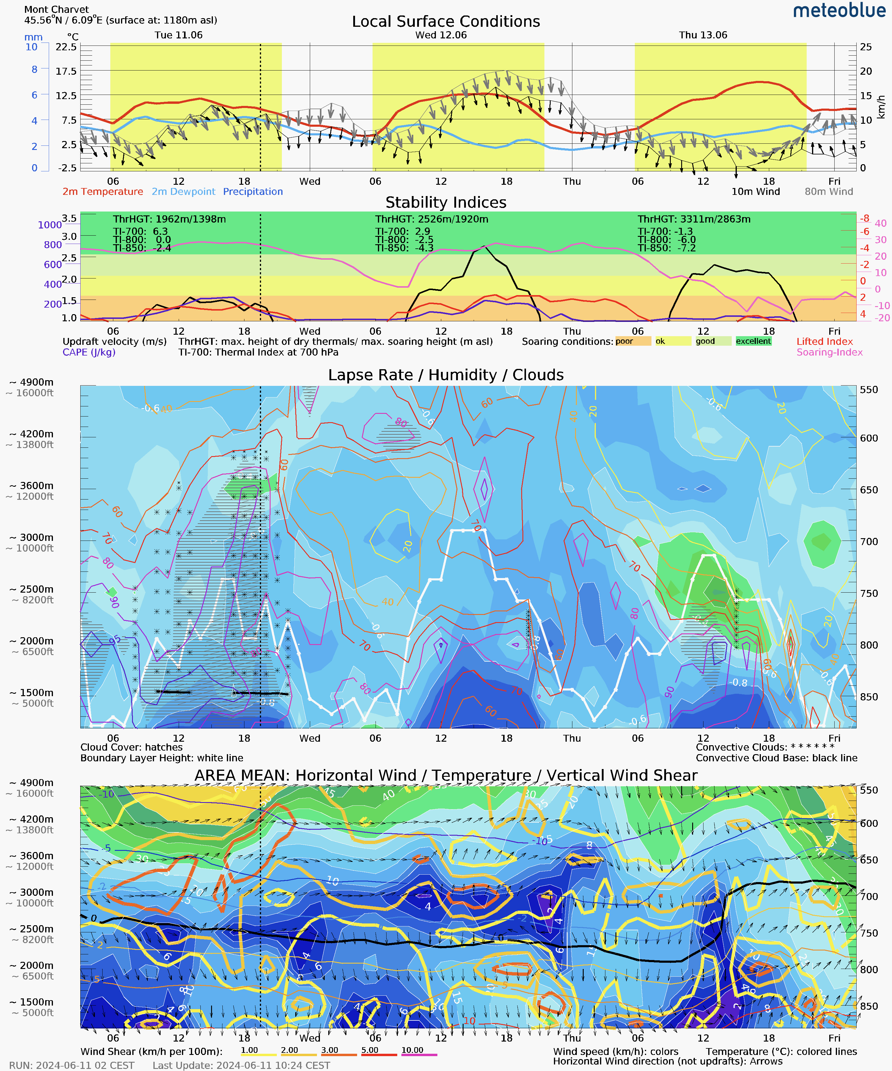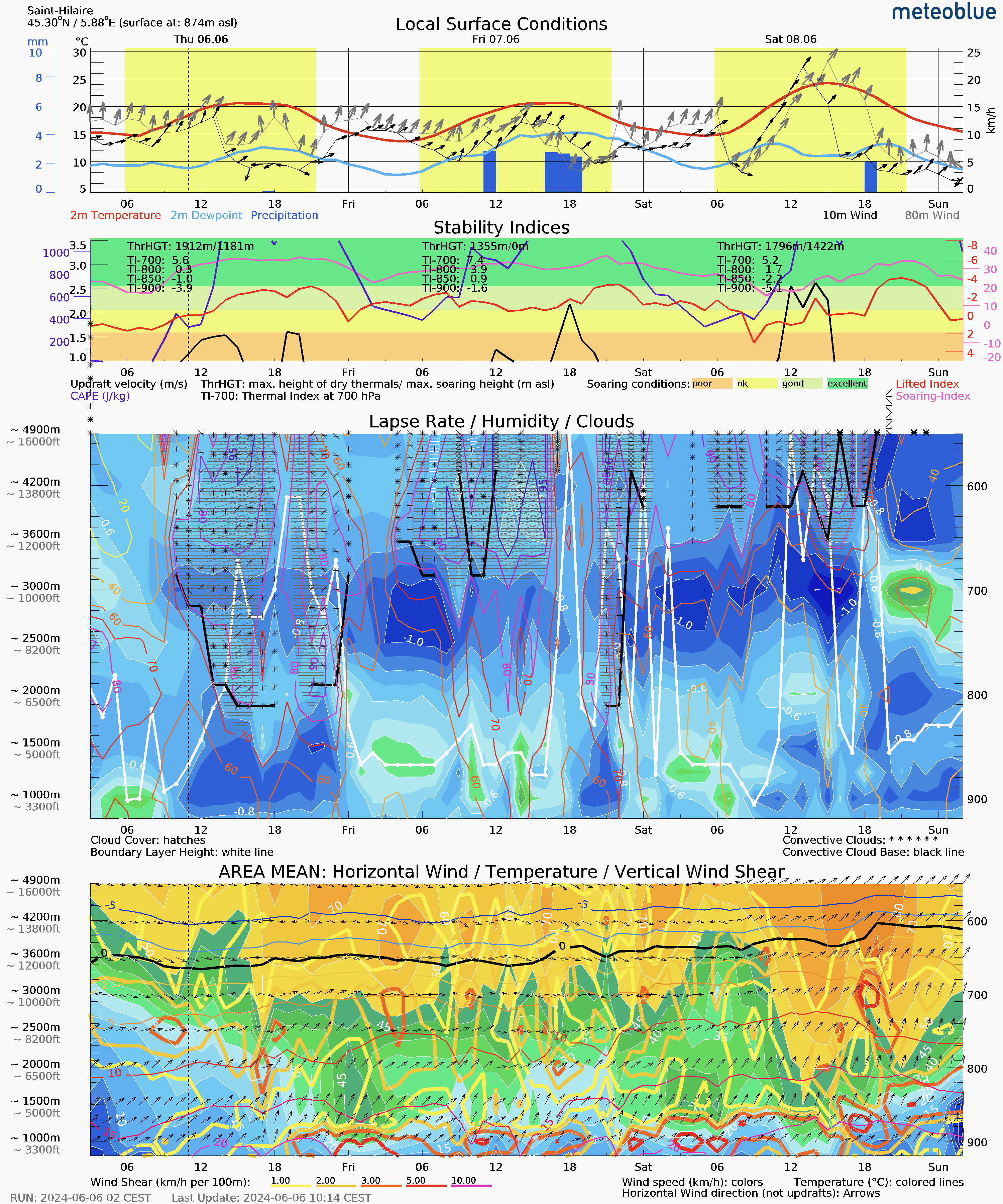 C’est une journée volable avec des plafonds qui dépasseront 2000 m mais le voile prévu vers 15h diminue fortement la possibilité de Cross.