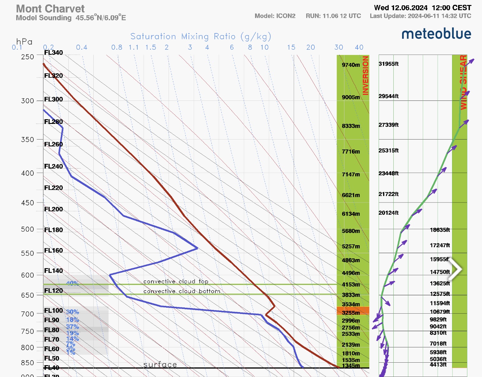 L’émagramme de 12h montre des nuages convectifs à 3800 m et une forte instabilité entre 1300 m et 2900 m avec un blocage à 3200 m