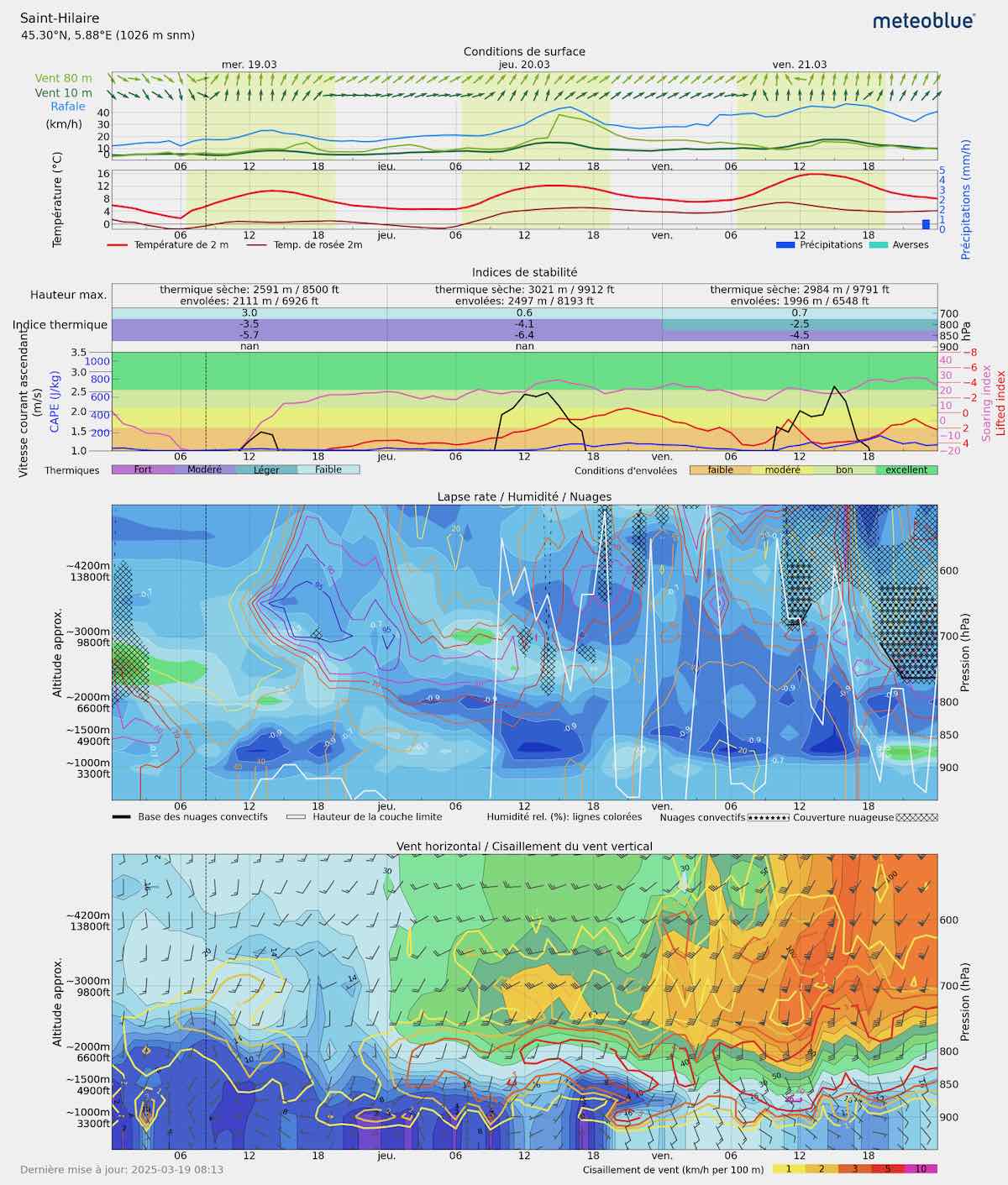 Conclusion : C’est une journée volable mais pas terrible, un peu de vent orienté sud jusqu’à 1200 m, avec des plafonds qui ne devraient pas dépasser 1500 m en Chartreuse.