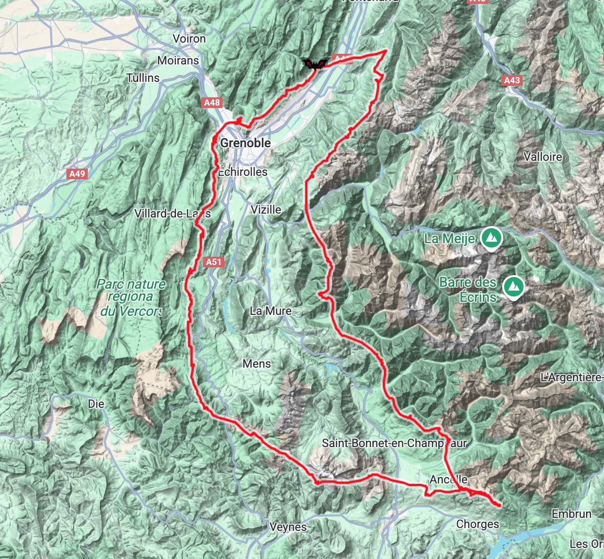 Triangle de 220 km au départ de St Hil reliant Pic de Bure, Aiguilles de Chabrière, Belledonne et goal à Lumbin. Le vol est remarquable surtout au début et jusqu’aux 2 soeurs où tout se passe par devant et par le bas avec une altitude max de plus ou moins 1200 m.