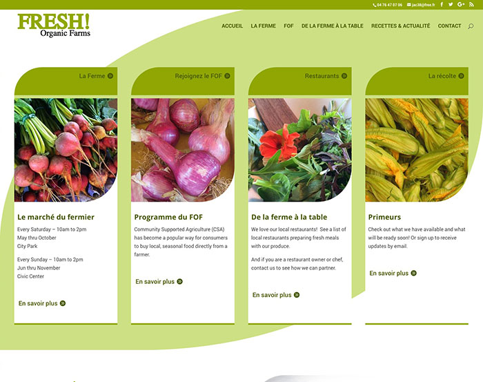 FRESH ! Projet de site pour une ferme écologique à Grenoble Voir le site FRESH Chef de projet : Divi Création Graphique : Divi Conception HTML : Jacques Bayol Production : Divi